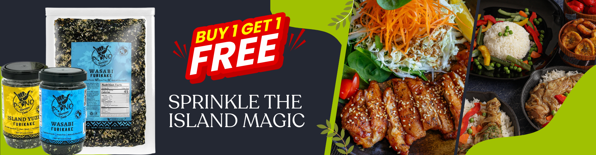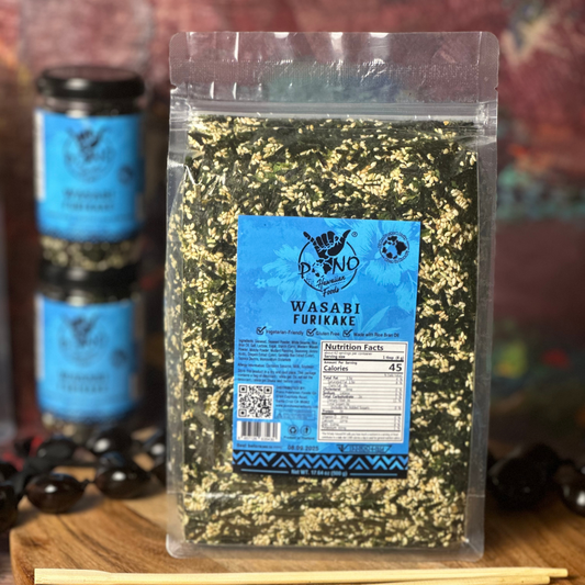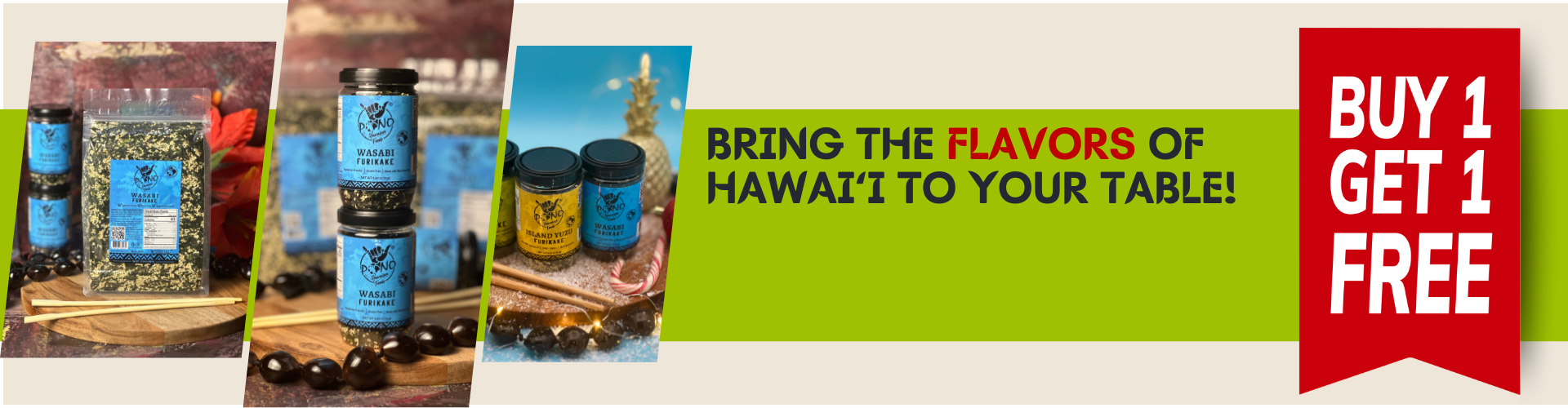 Pono Hawaiin Foods brings the very best in islands-style favorites to your kitchen table. Maui boy owned and mainland operated! Our premium flagship Nori Komi Furikake has an amazing balance of sweet, salty, and Umami flavors mixed with lightly toasted sesame seeds and nori seaweed to create the island classic everyone knows and loves! Just launched our new Island Yuzu Furikake and Wasabi-Nori Furikake. Coming soon our new To-Go pack furikake packets and our new Island style Chili Crunch!