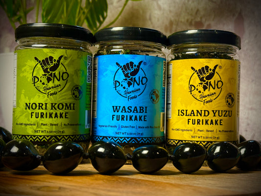 Our premium flagship island style Nori Komi Furikake has a rich and delicious flavor! Furikake originally from Japan, and introduced to the Hawaiian Islands during the sugar cane plantation era of the 1800’s. It's been an island favorite ever since!